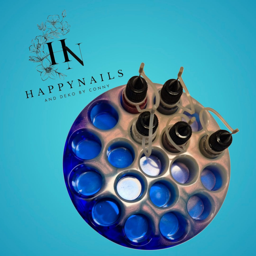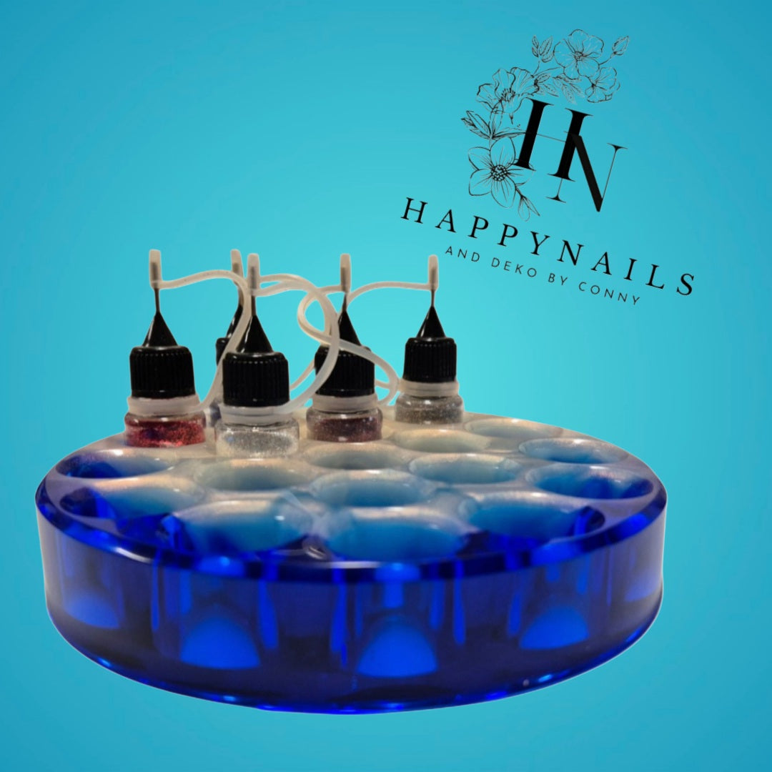 Er bietet Platz für 19 Glitzerflaschen und besteht aus leicht zu reinigendem Epoxidharz.