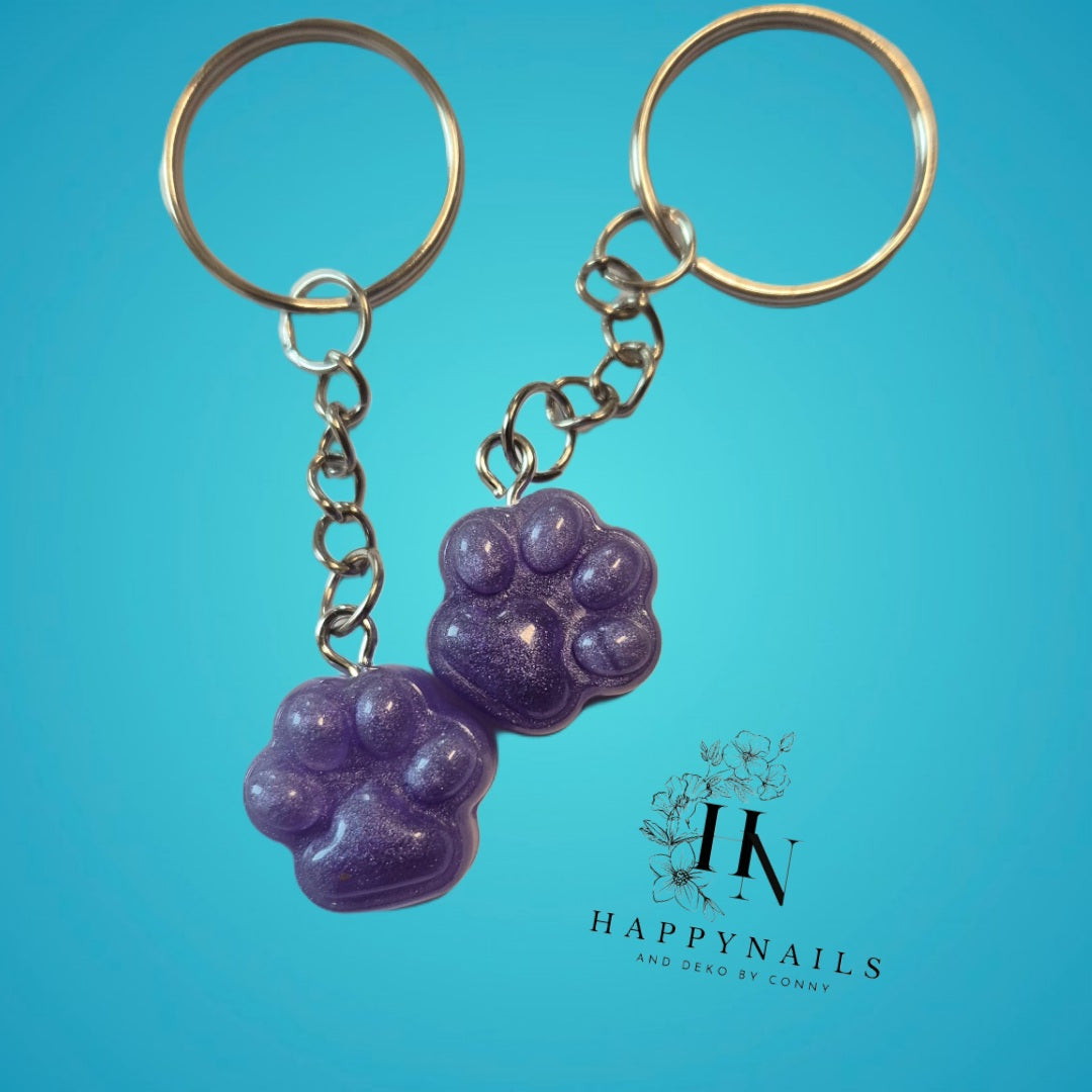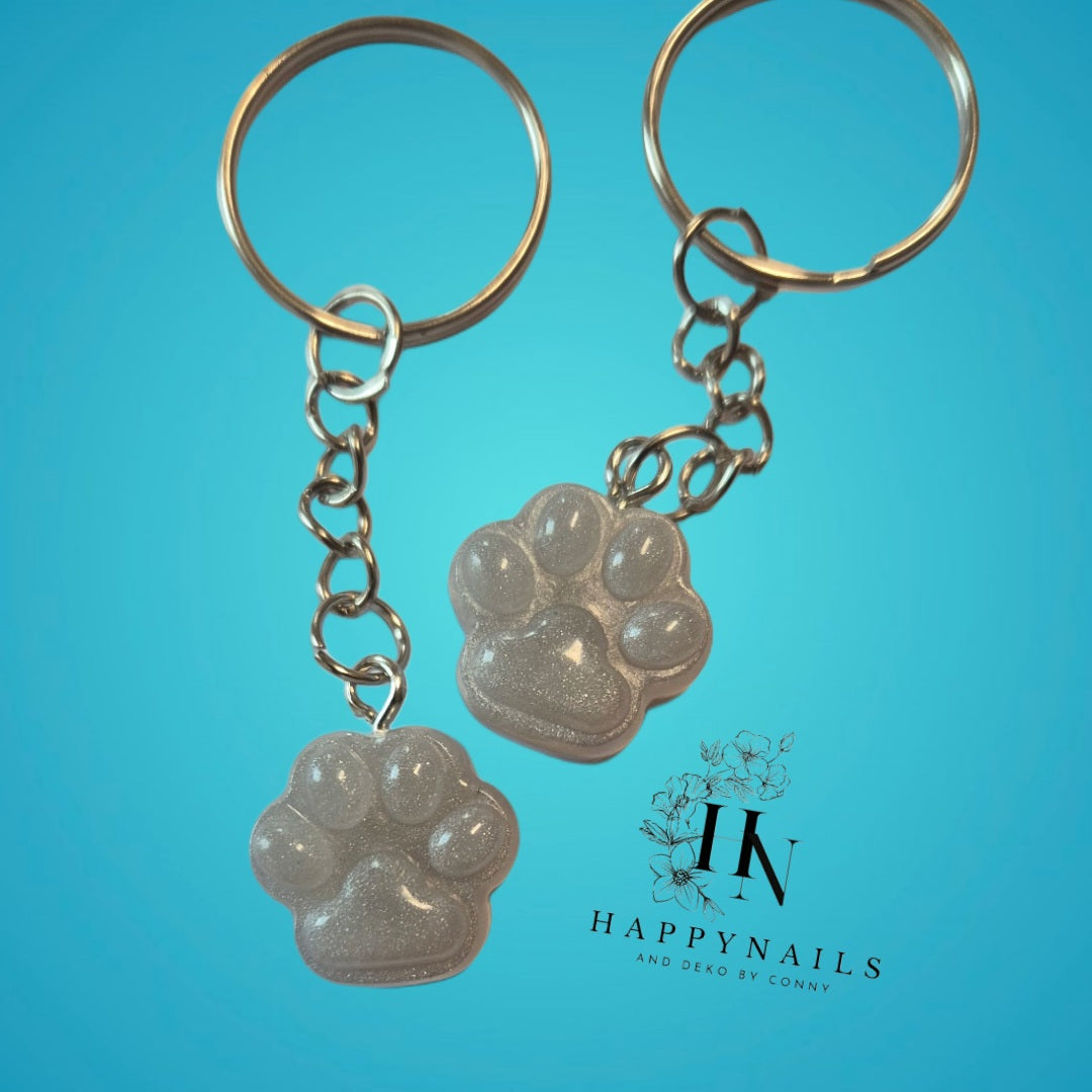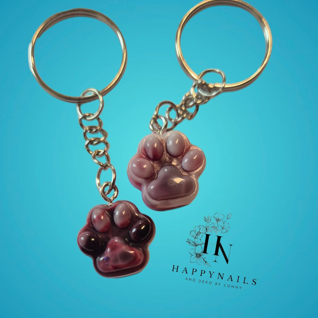 Handgemachte Hundepfoten Schlüsselanhänger aus Epoxidharz in verschiedenen Farben.